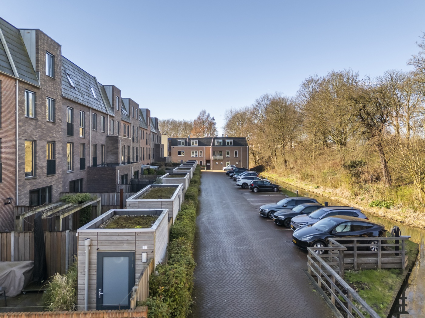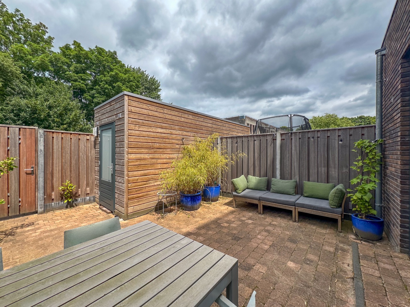 Achter de woning ligt een zonnige, onderhoudsvriendelijke tuin met een royale berging voorzien van een groen mos-sedumdak. Deze buitenruimte biedt volop plek om met het hele gezin te genieten van de zon en buitenlucht.