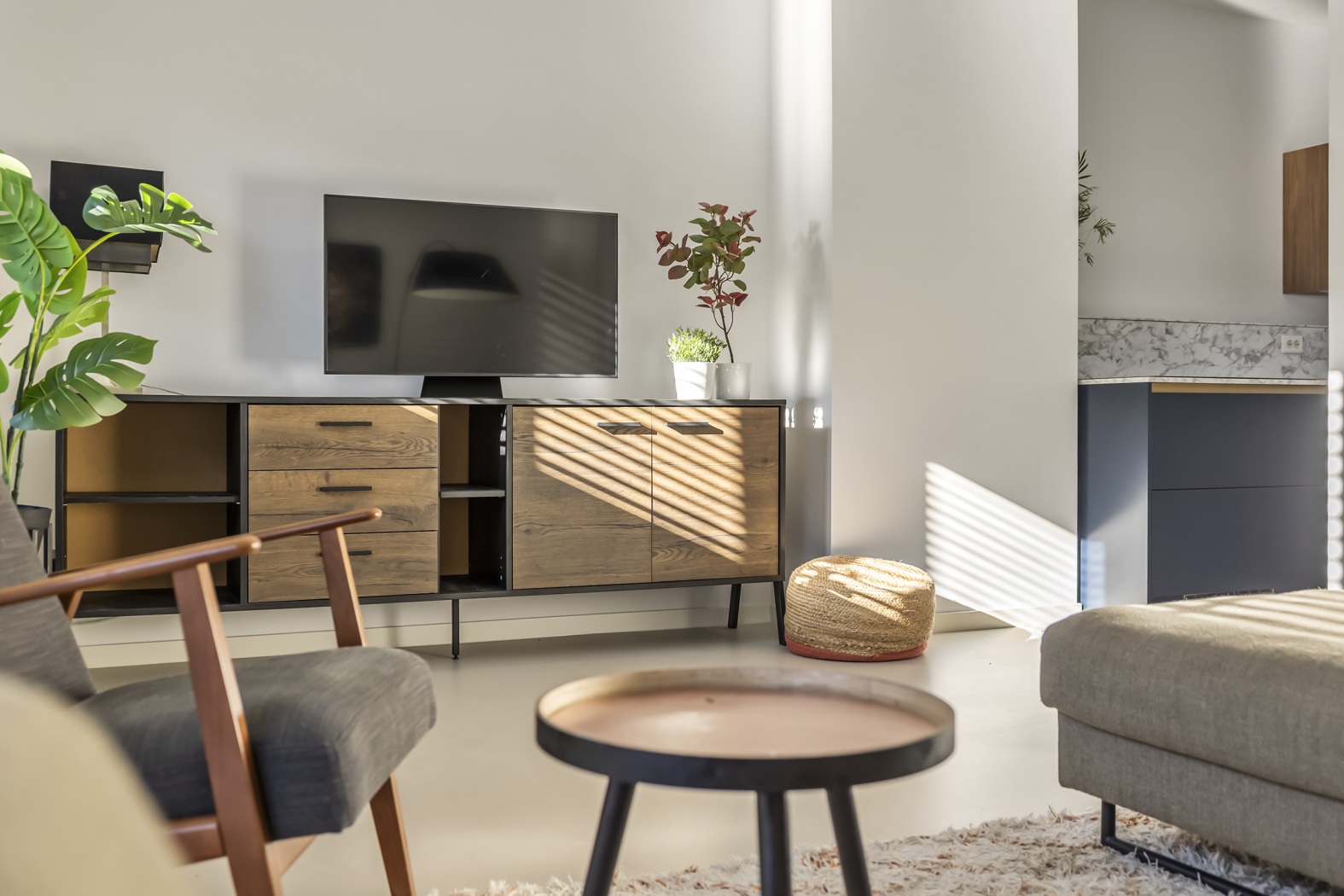 De woonkamer is voorzien van een tweede, stijlvol afgewerkt keukenblok met moderne inbouwapparatuur, waaronder een oven, een koelkast en een strak vormgegeven kookplaat met geïntegreerde afzuigkap.
