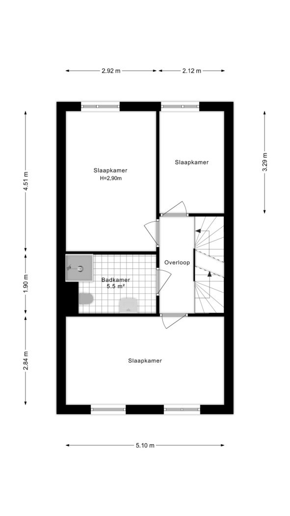 Aan weerszijden van de badkamer bevinden zich drie volwaardige slaapkamers. De ouderslaapkamer beslaat de volledige breedte van de woning en biedt volop ruimte voor een kingsize bed én een garderobekast, een rustige, royale plek om de dag ontspannen te beginnen of af te sluiten.