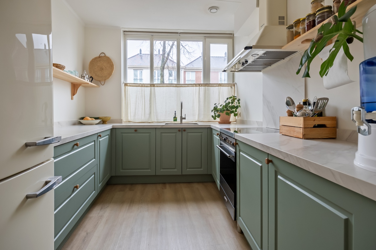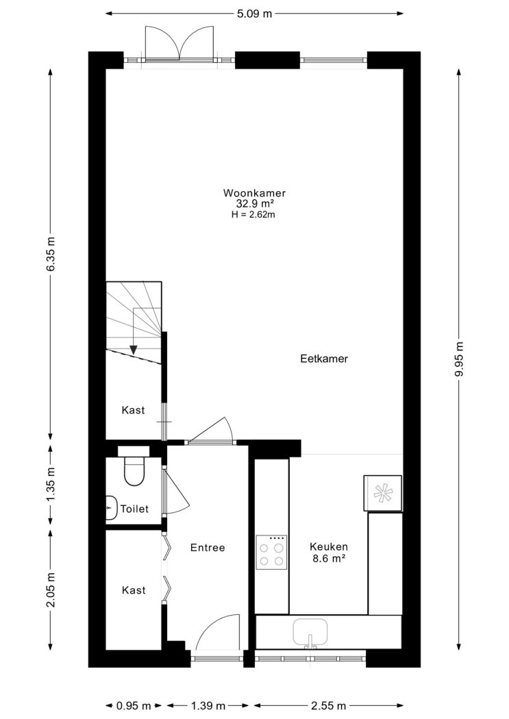 Via de entree kom je binnen in de hal met toegang tot het toilet en de leefruimte. De woonkamer voelt direct ruim en licht aan dankzij de grote raampartijen en de openslaande deuren naar de tuin. Hier is volop plek voor een comfortabele zithoek én een royale eettafel. De open keuken, volledig vernieuwd in 2025, vormt het hart van de woning en is modern uitgevoerd met alle gewenste inbouwapparatuur, ideaal voor wie graag kookt en gasten ontvangt. De directe verbinding met de tuin zorgt ervoor dat binnen en buiten naadloos in elkaar overlopen.