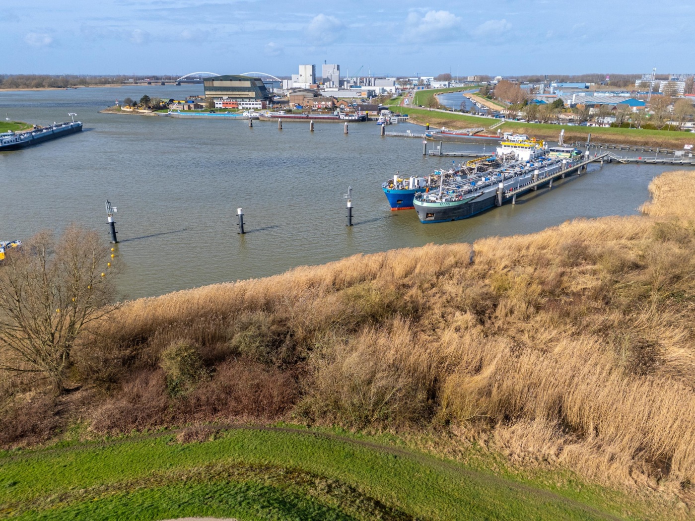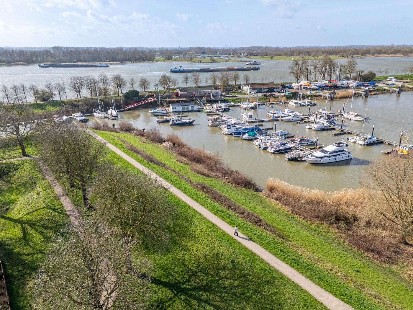 Vanuit de woonkamer heb je een vrij en levendig uitzicht richting de stadswallen, de rivier en de vluchthaven. De combinatie van groen, water en het zicht op wandelaars over de stadswallen zorgt voor een open, ontspannen sfeer met altijd iets te zien.