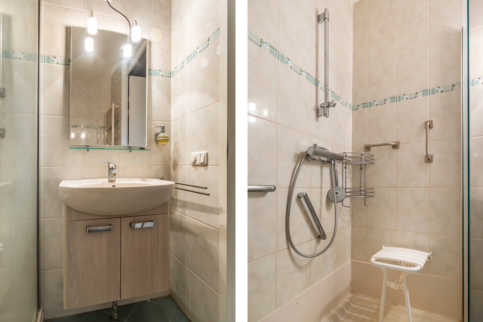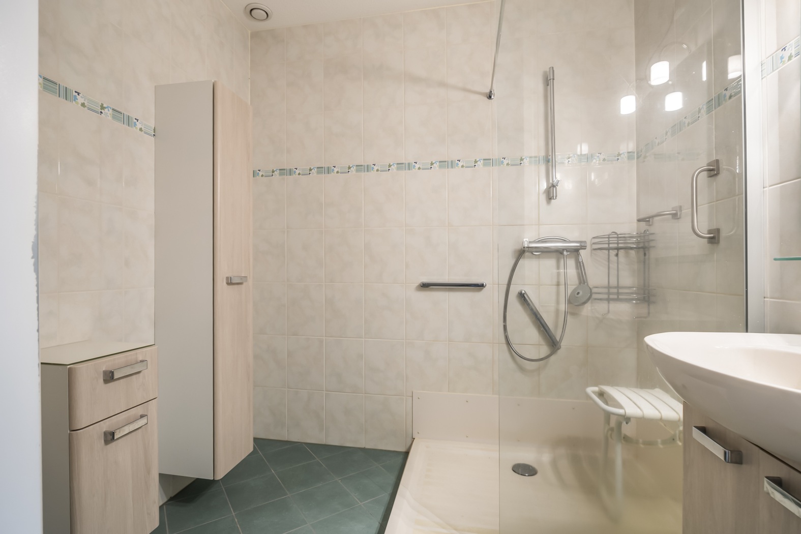 •Nette badkamer met inloopdouche en wastafelmeubel