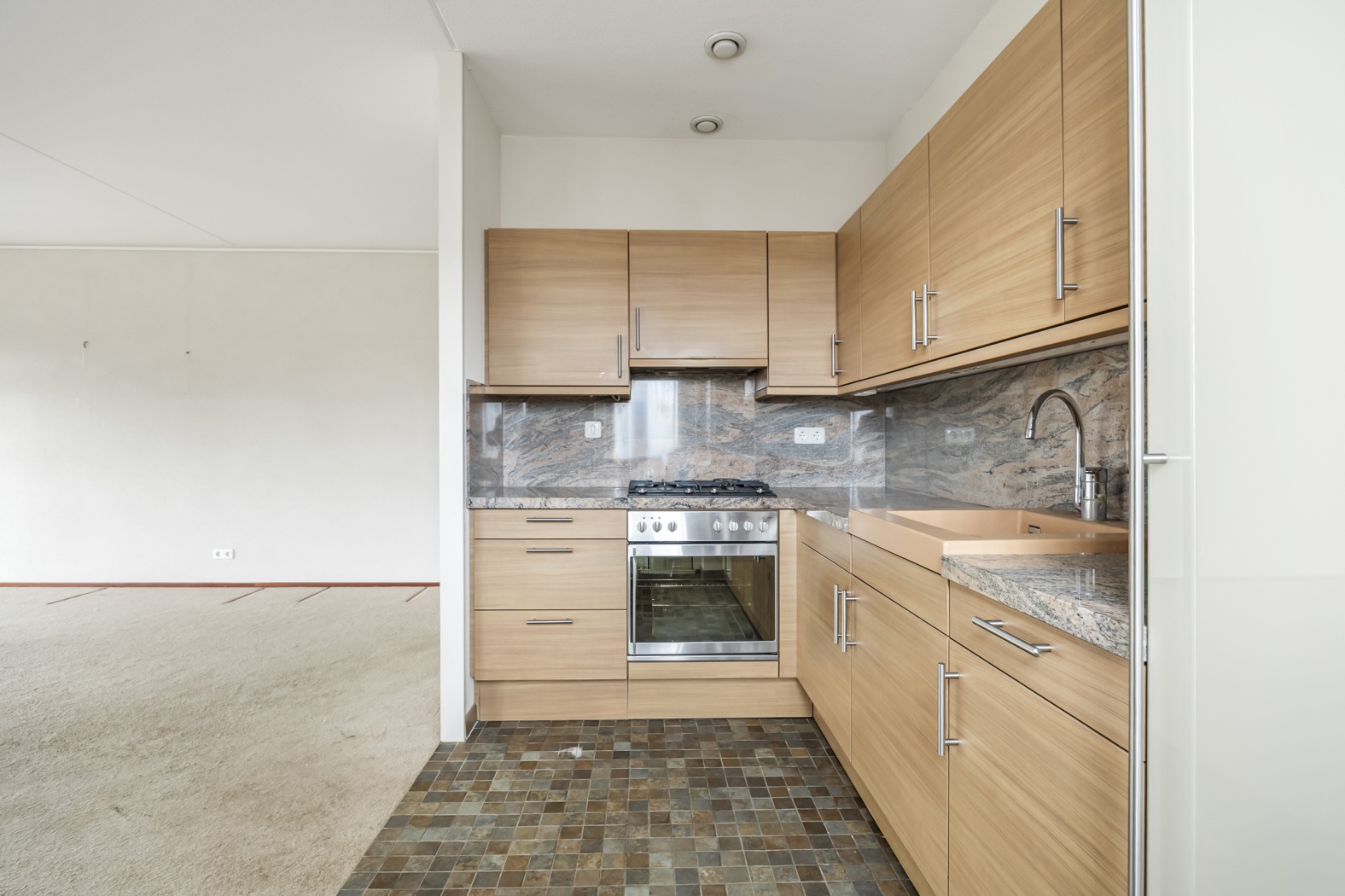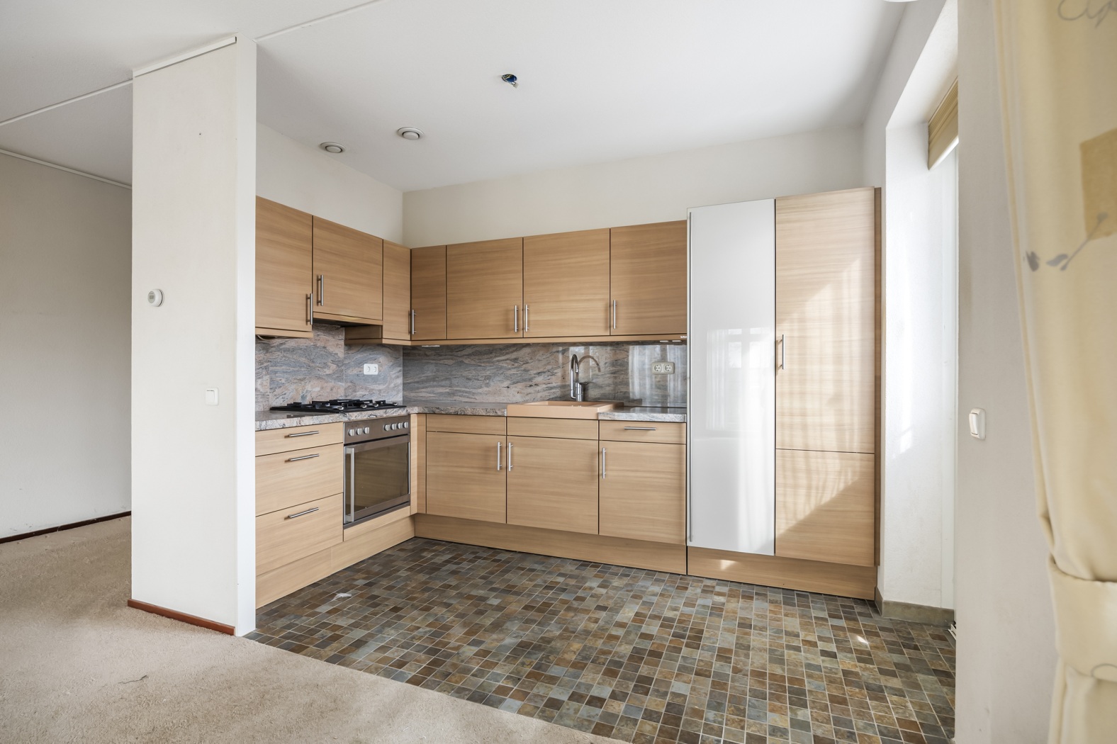 De half open keuken sluit naadloos aan op de woonkamer en is praktisch ingericht in een L-opstelling met houtlook kastfronten, gecombineerd met een natuurstenen werkblad en achterwand. De keuken biedt volop werk- en kastruimte en is voorzien van diverse inbouwapparatuur. Of je nu uitgebreid wilt koken of snel iets op tafel wilt zetten, deze keuken maakt het gemakkelijk en gezellig.