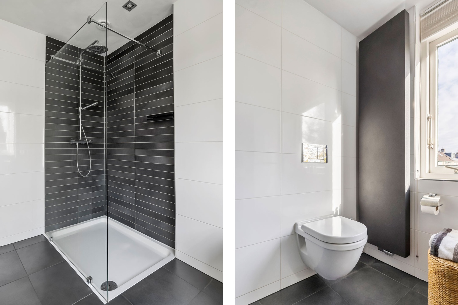 Aan de voorzijde is de badkamer van circa 6 m², modern en ruim opgezet. Mooie tegels, een dubbele wastafel met spiegel, een riante inloopdouche met regendouche, een tweede zwevend toilet en een designradiator zorgen voor een ontspannen wellness gevoel. Hier kun je ’s ochtends écht rustig opstarten.